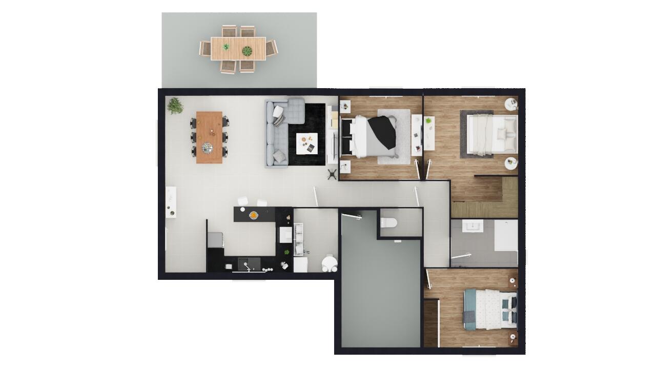 Découvrez ce projet de maison en ossature bois, pensée pour allier confort et fonctionnalité. Organisée en forme de L, elle offre deux espaces distincts :