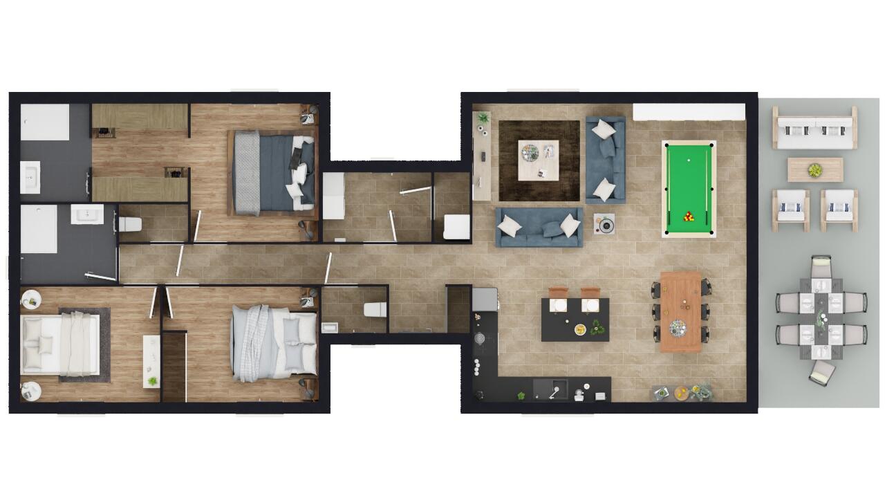 • Volume nuit : 3 chambres, dont une suite parentale avec salle d’eau et dressing, plus une 2ème salle d’eau pour plus de confort.