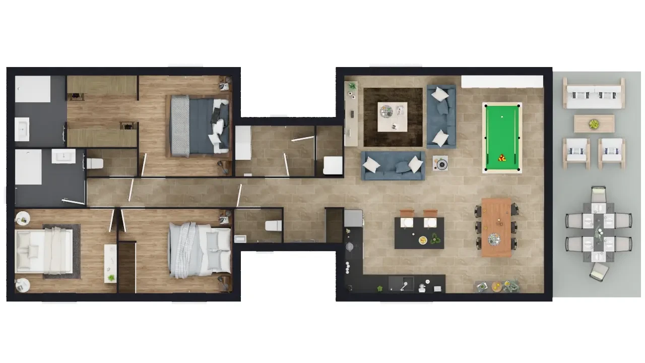 • Volume nuit : 3 chambres, dont une suite parentale avec salle d’eau et dressing, plus une 2ème salle d’eau pour plus de confort.