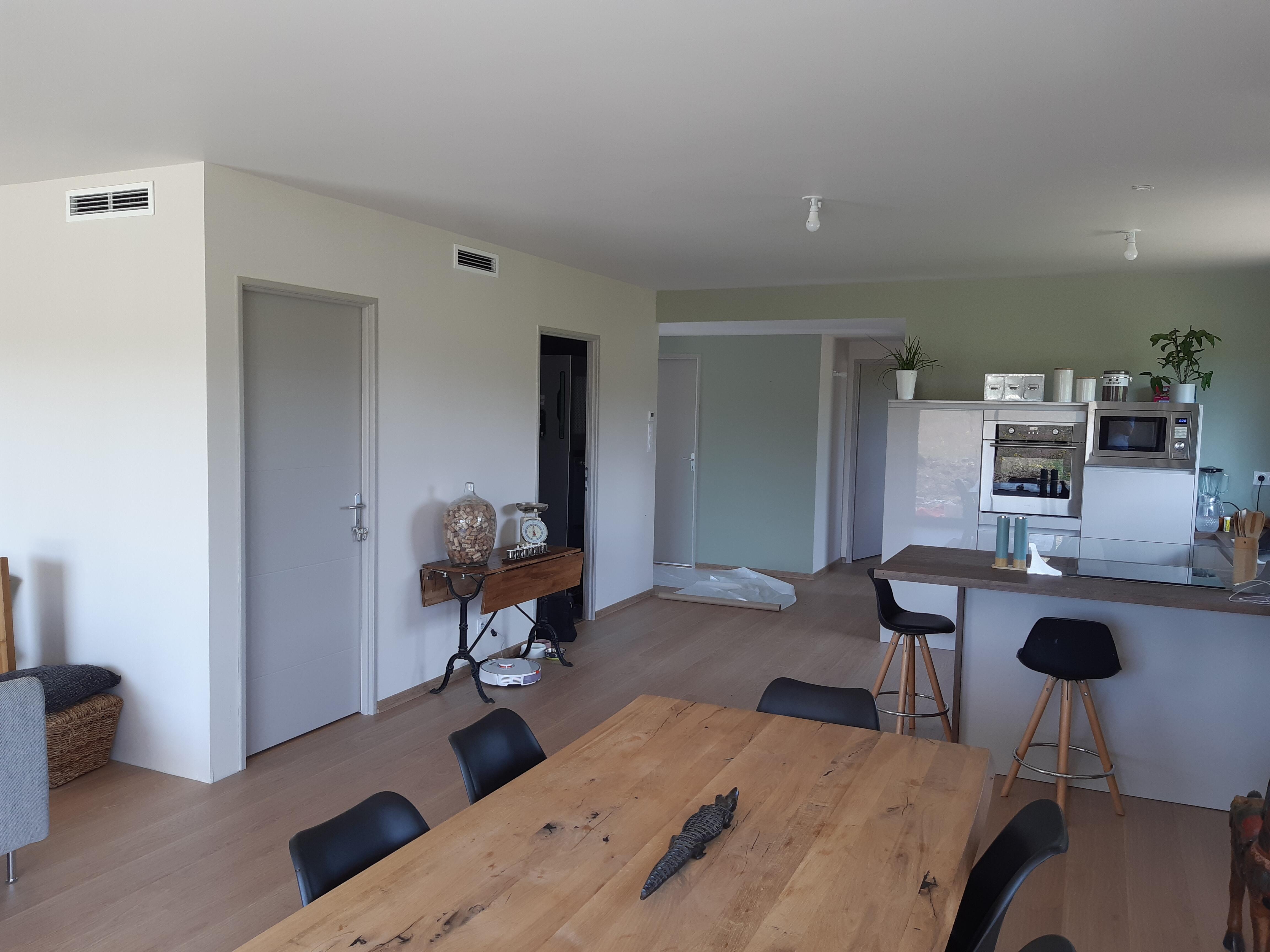 Le sol stratifié, posé dans l'ensemble des pièces, renforce l'atmosphère chaleureuse et homogène de l'habitation.