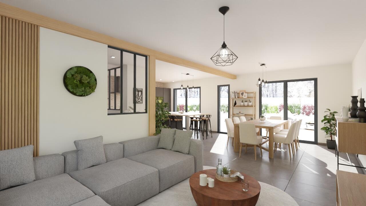 Une grande pièce de vie lumineuse avec cuisine ouverte