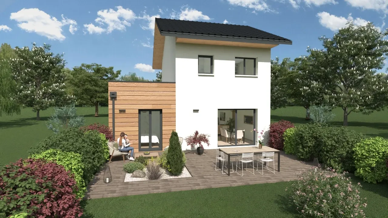Maisons Naturéa, constructeur local de maison en ossature bois, vous propose le projet d'une maison à étage de 96m2 comprenant 4 chambressur un terrain plat de 562m2 à Pers Jussy, situé à 5 minutes de la gare de Reignier.