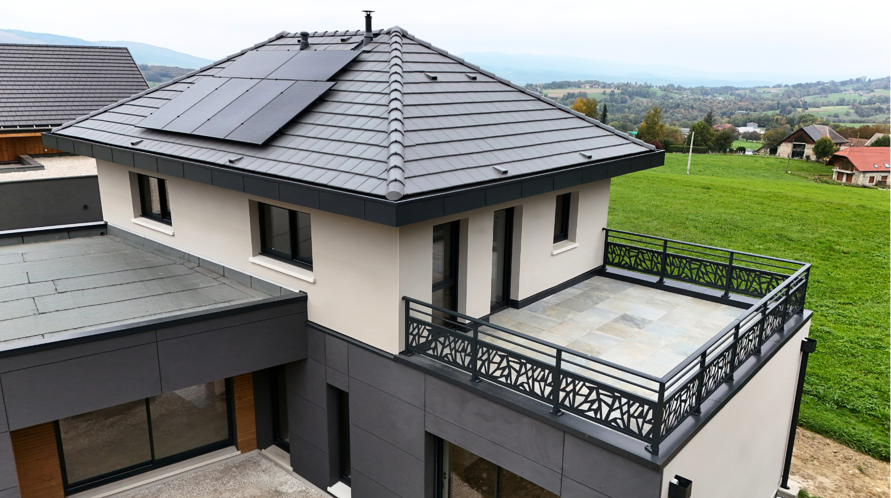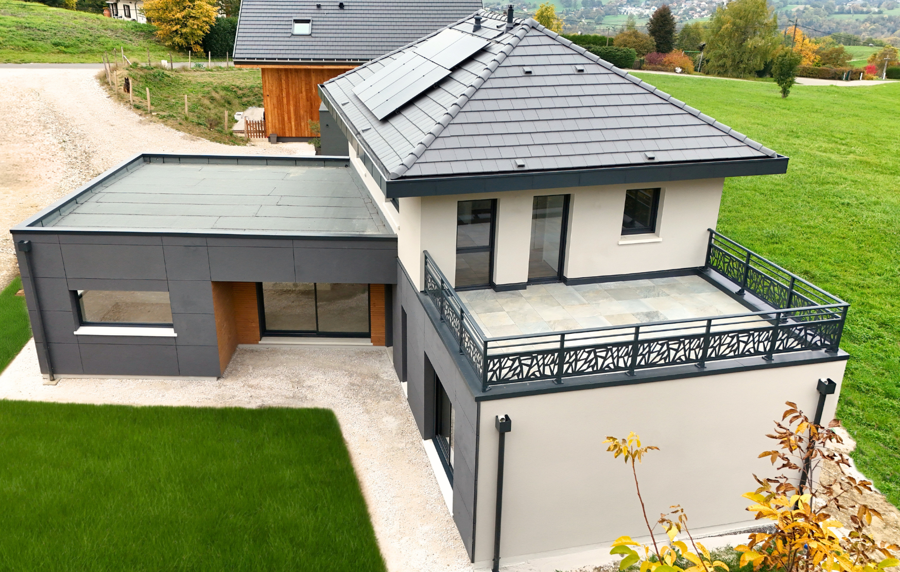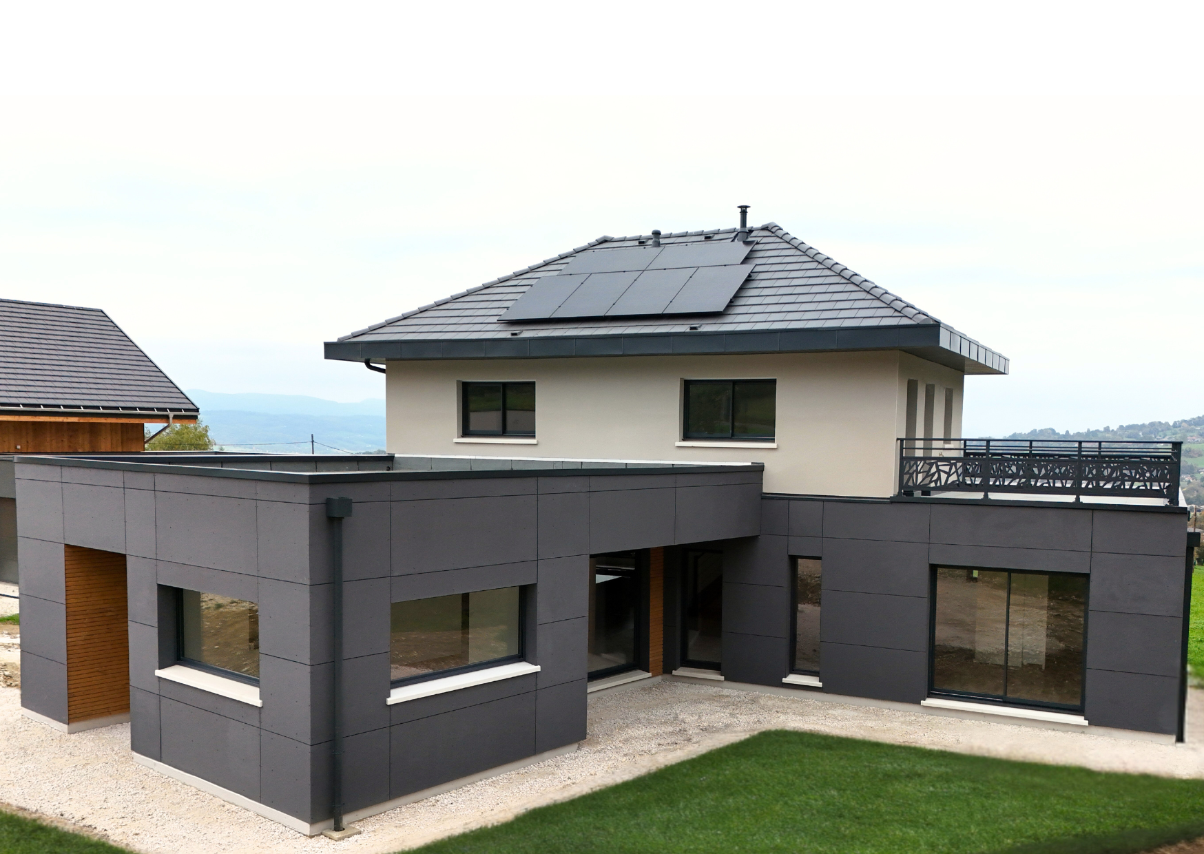 La maison de Jorg et Sophie est bâtie sur un terrain de 1428m². Elle est composée d'un volume principal en toiture 4 pans et de 2 modules toit plat, l'un végétalisé et l'autre avec terrasse accessible depuis la mezzanine.
