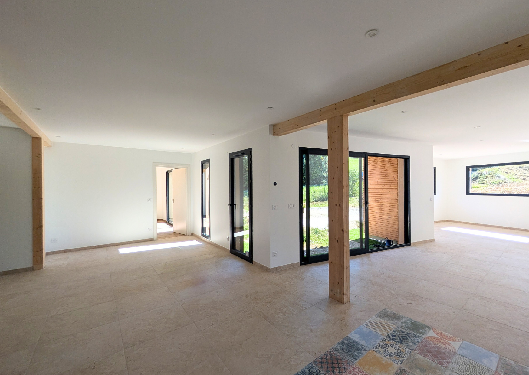 À l'intérieur, on arrive dès l'entrée dans une pièce de vie de 80m² qui dessert :