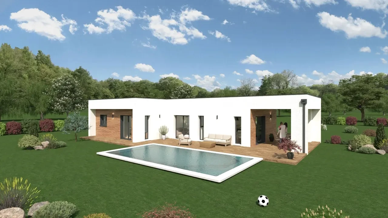 Projet de construction de maison à ossature bois, design contemporain, 4 chambre, très lumineuse, carport 2 voiture, terrasse couverte