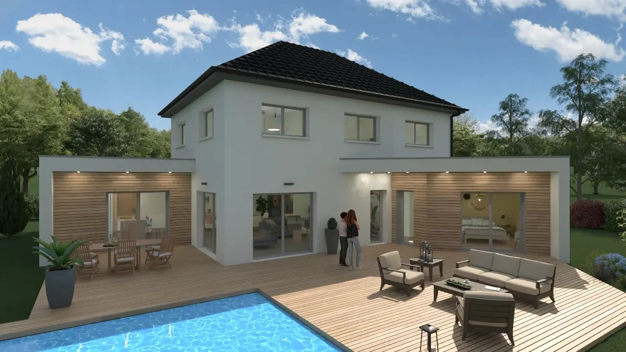 Maison à ossature bois, architecture travaillée, 5 chambres, 1 garage, des volumes confortables.