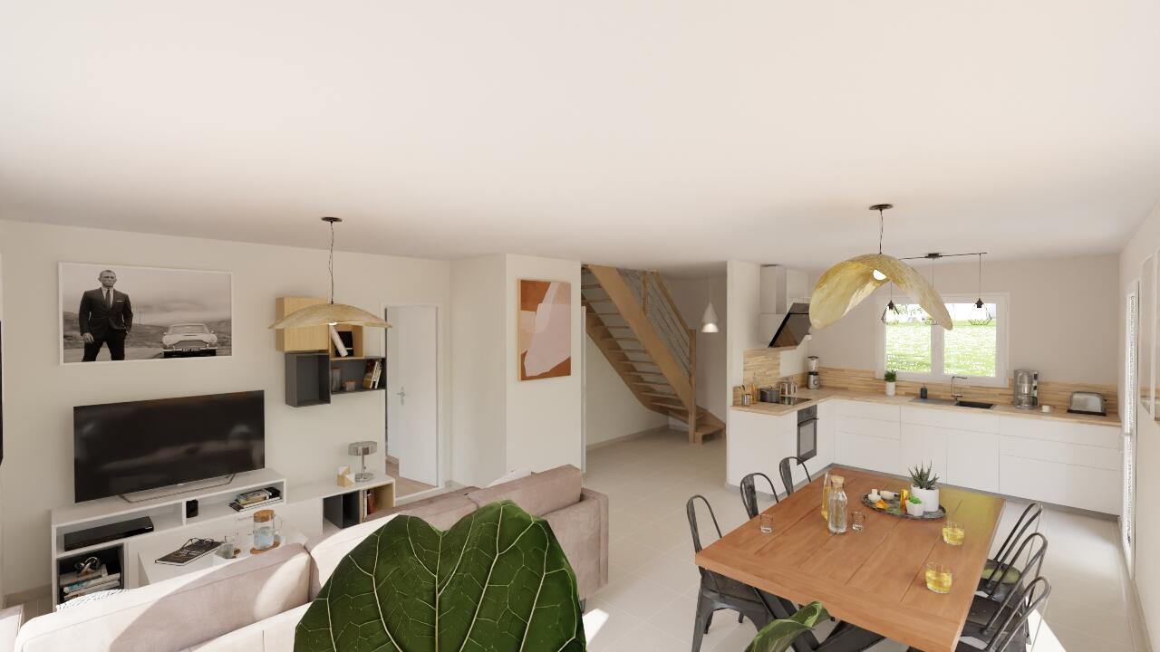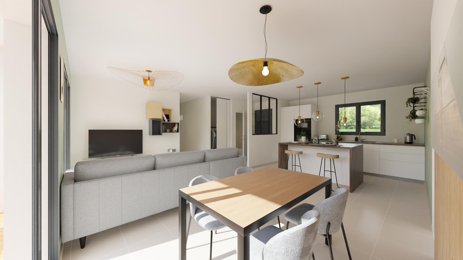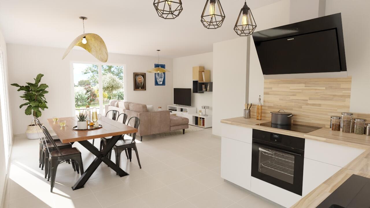 Sur un terrain de 1000 m², cette maison de 100 m² offre une belle pièce de vie avec cuisine ouverte, des chambres lumineuses, une salle d’eau moderne et un cellier fonctionnel.