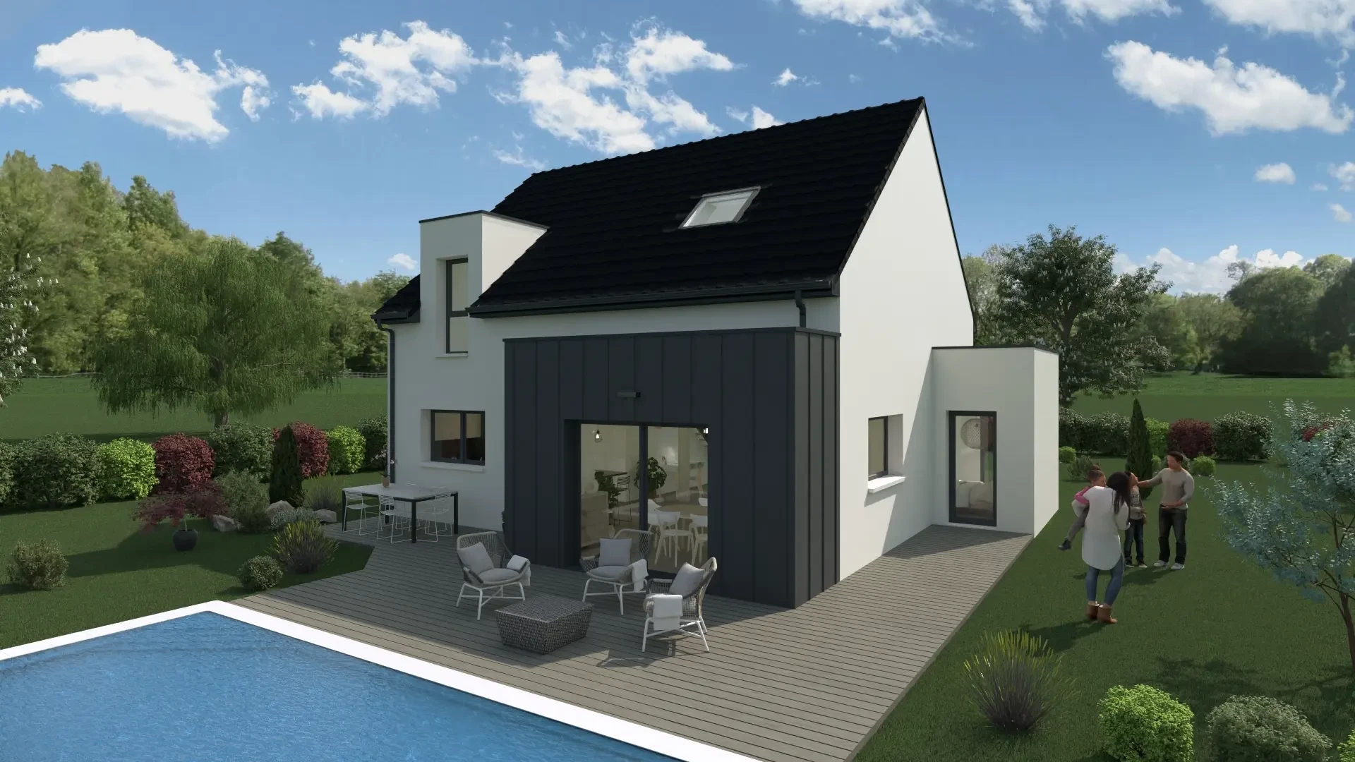 Mélia, au design entre tradition et modernité, est adaptée à une parcelle rectangulaire standard. En tant que maison éco-conçue, cette inspiration, comme toutes celles de la collection Maisons Naturéa, repose sur une ossature bois solide et durable. Autant par l’origine des matériaux que par les économies d’énergie, le choix d’une construction en bois est un acte d'engagement écologique.