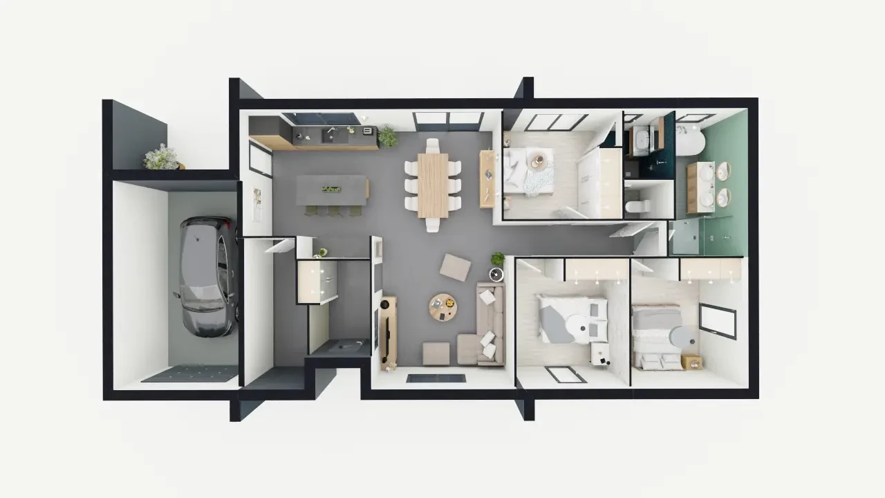 Proposition d’aménagement intérieur de la maison en vue 3D. Tous les plans de maisons sont personnalisables.