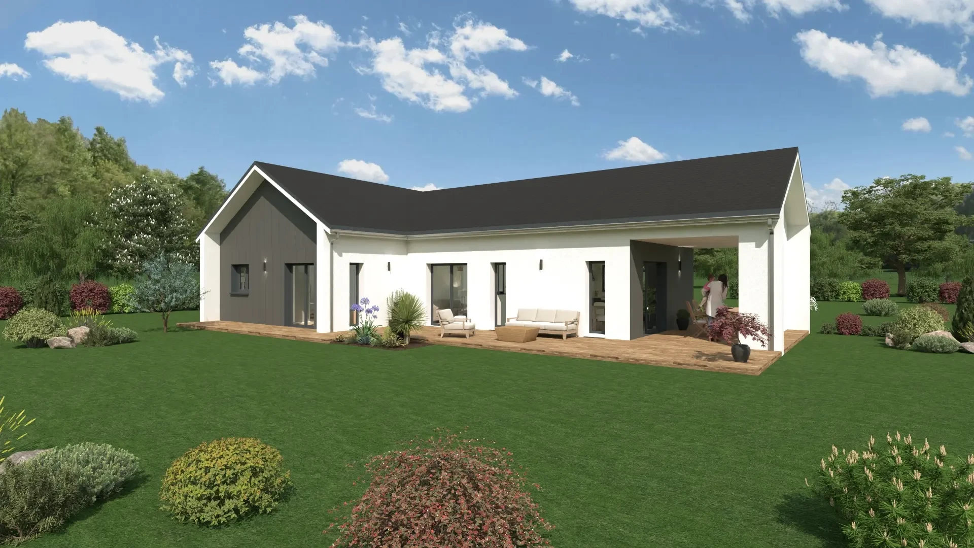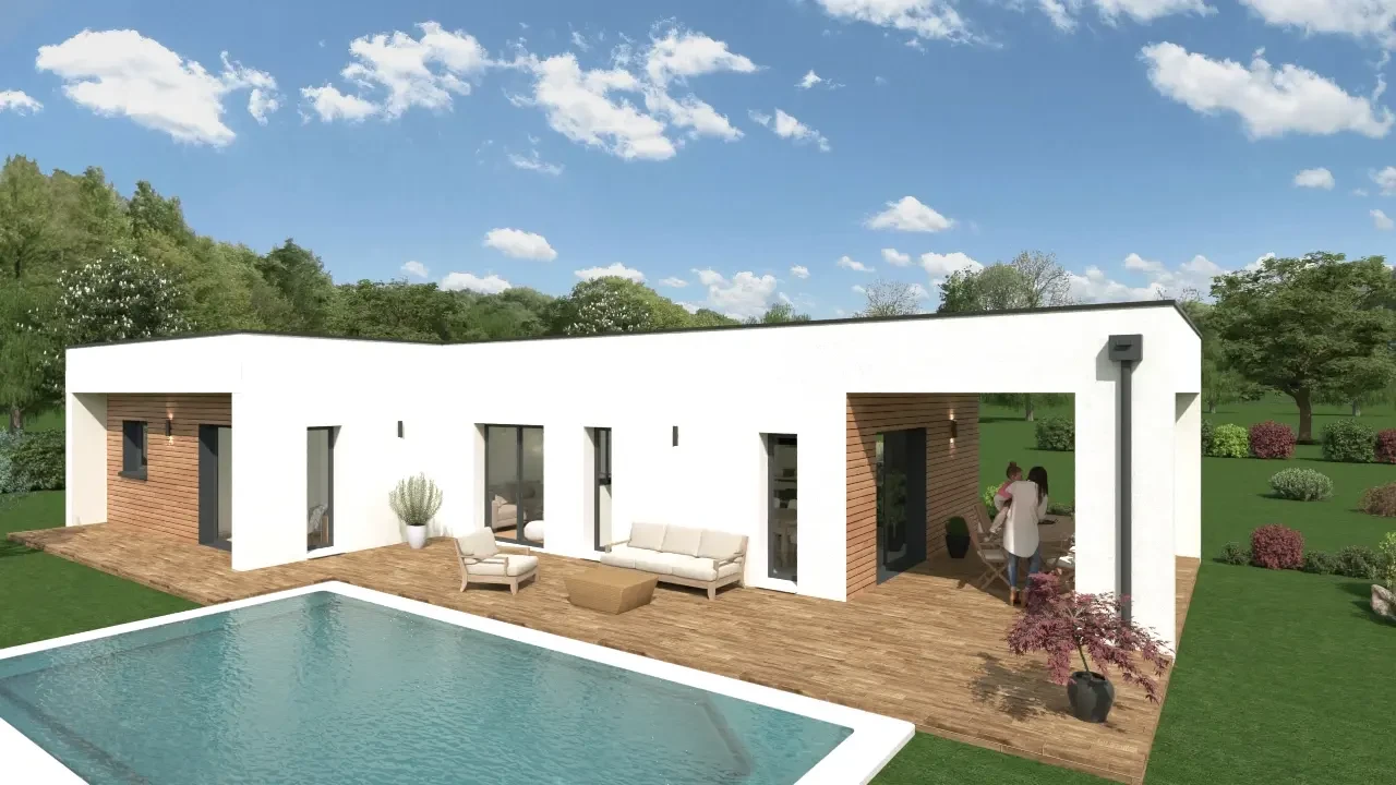 Offrant une vaste pièce principale où se rejoignent la cuisine, le salon et le coin repas, la maison se veut conviviale. Cet espace ouvert se prolonge à l'extérieur sur une terrasse couverte intimiste et une plateforme longeant l’habitat. Les 3 ou 4 chambres s’organisent parfaitement avec les salles d’eau. Parmi elles, on retrouve aussi une suite parentale spacieuse.