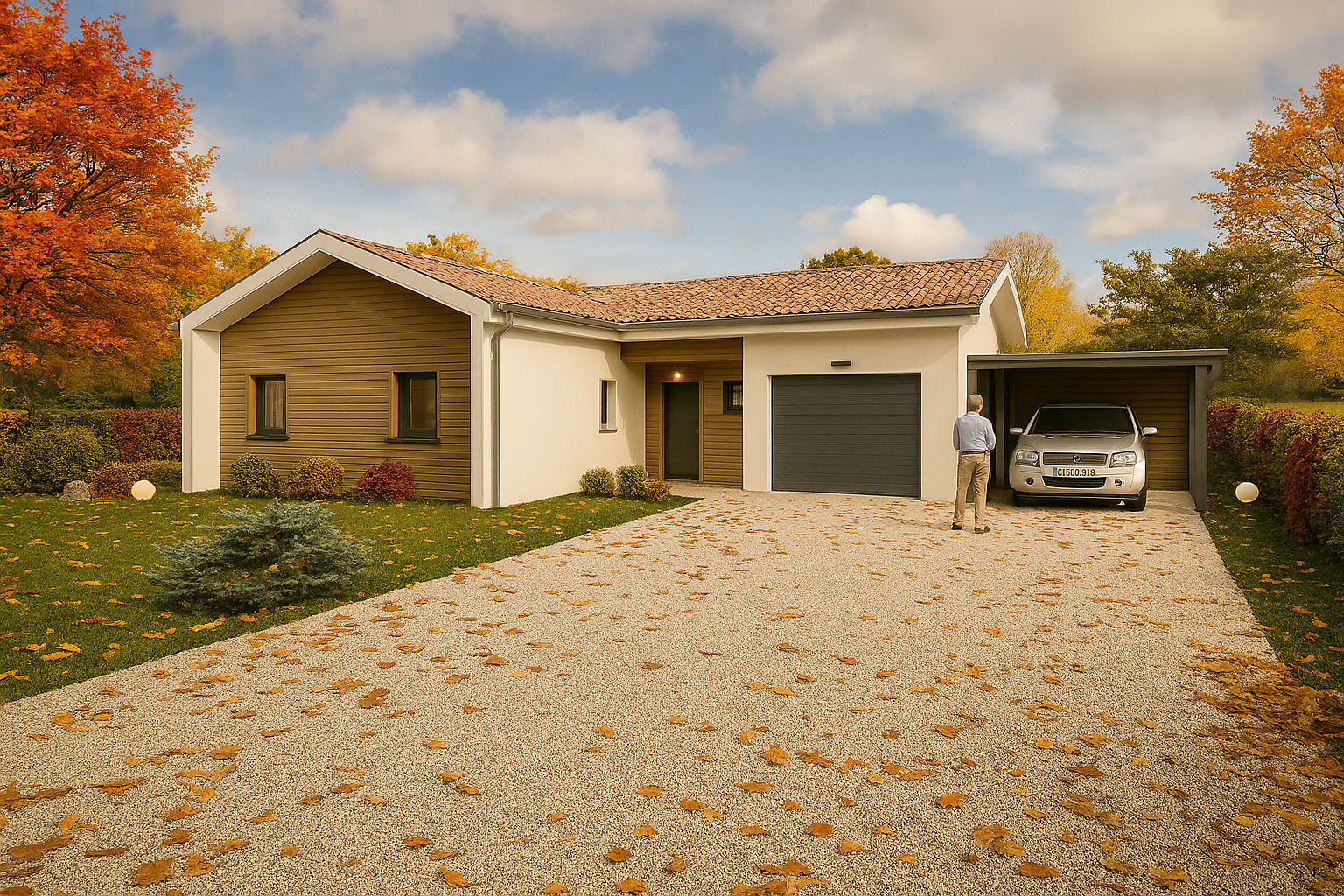 Cette maison de plain-pied se distingue par son architecture contemporaine et chaleureuse, alliant un bardage en bois à des enduits clairs pour une intégration parfaite.