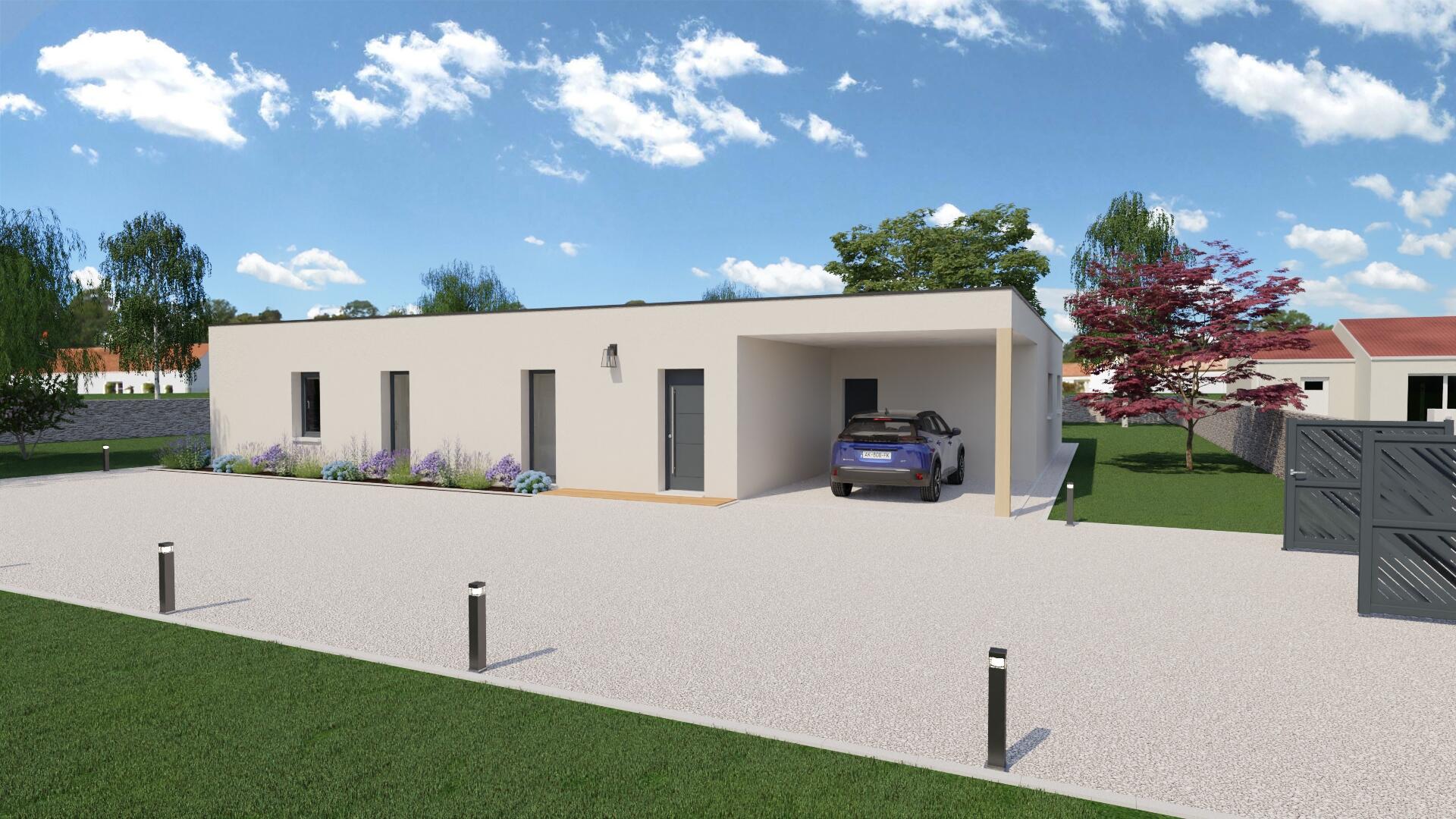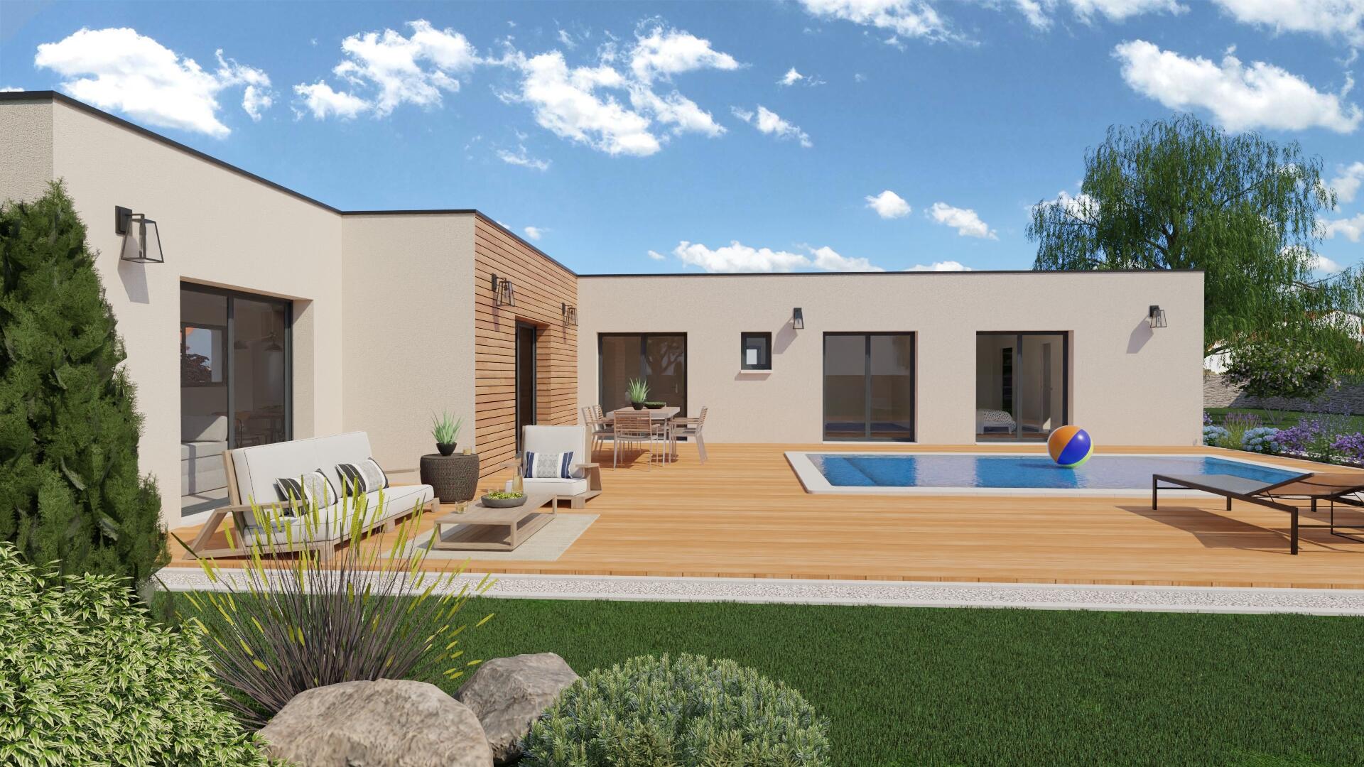 Maison moderne de 122 m², au style et design bien pensé. Toit plat, enduit crépis et quelques touches de bardage bois pour un effet moderne et chaleureux.