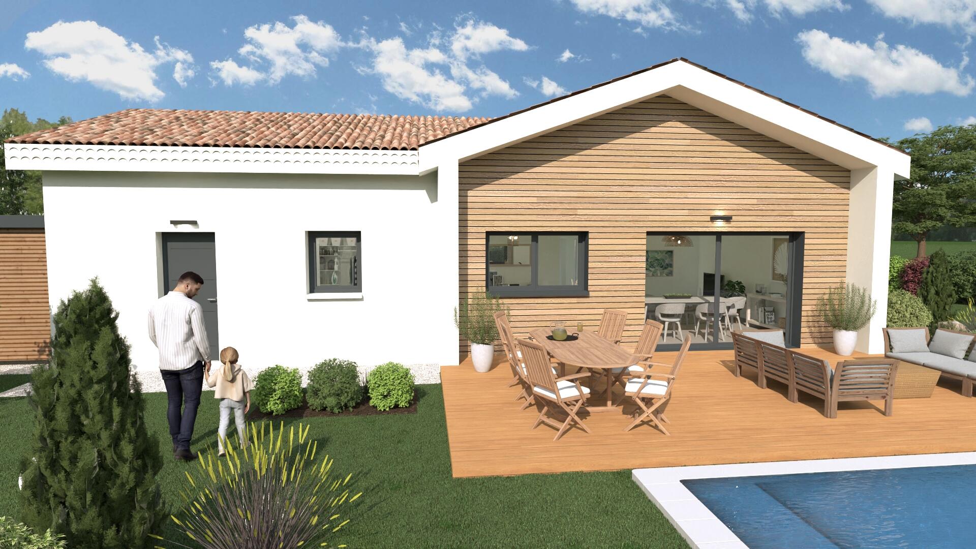 Espaces de vie lumineux : Profitez d'une pièce de vie traversante avec cuisine ouverte, salon et salle à manger, baignée de lumière naturelle grâce à de larges ouvertures. L'accès direct à la future terrasse en bois et à la piscine (comme illustré) promet des moments inoubliables.