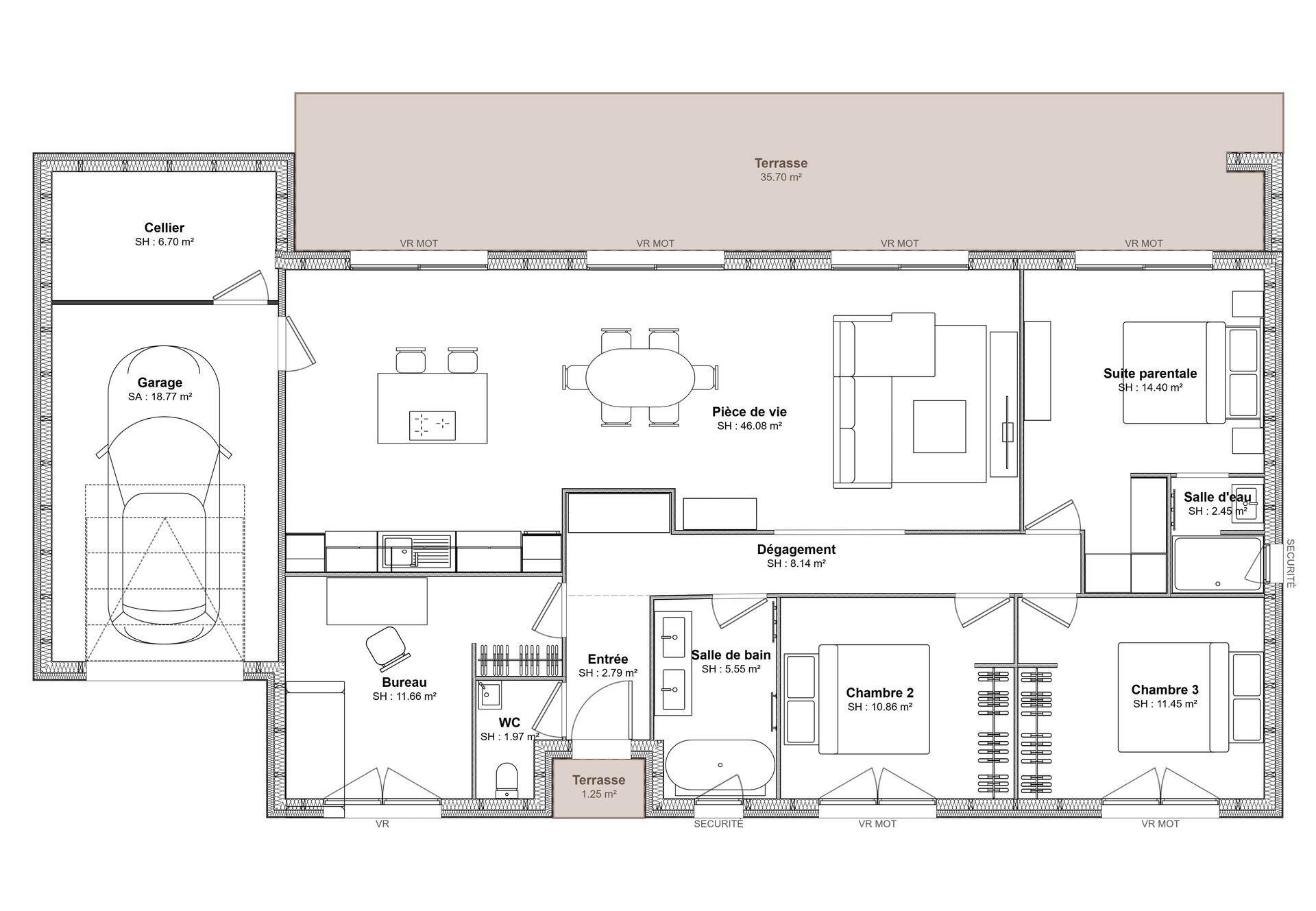 🏠 Projet de maison au design moderne et élégant à personnaliser selon vos envies, de 110 m² habitables, alliant confort, esthétisme et fonctionnalité. Son toit plat affirmé et ses lignes épurées lui confèrent une allure résolument contemporaine.