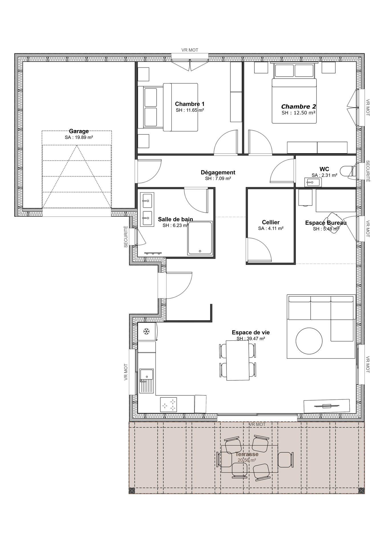 Nous vous proposons un modèle de plain-pied optimisé de 88 m² habitables, parfait pour un jeune couple, une petite famille ou des personnes souhaitant un habitat facile à vivre.