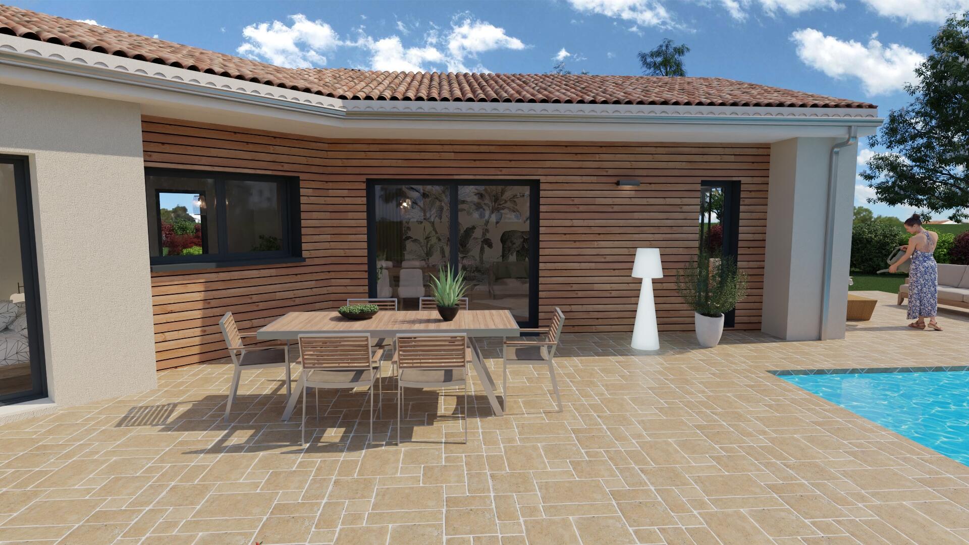 ✅ Espace de vie (50 m²) : un superbe séjour/cuisine traversant et lumineux, ouvert sur l'extérieur grâce à de larges baies vitrées, prolongé par une terrasse conviviale avec piscine. L'alliance du crépi et du bardage bois offre un cachet extérieur chaleureux.