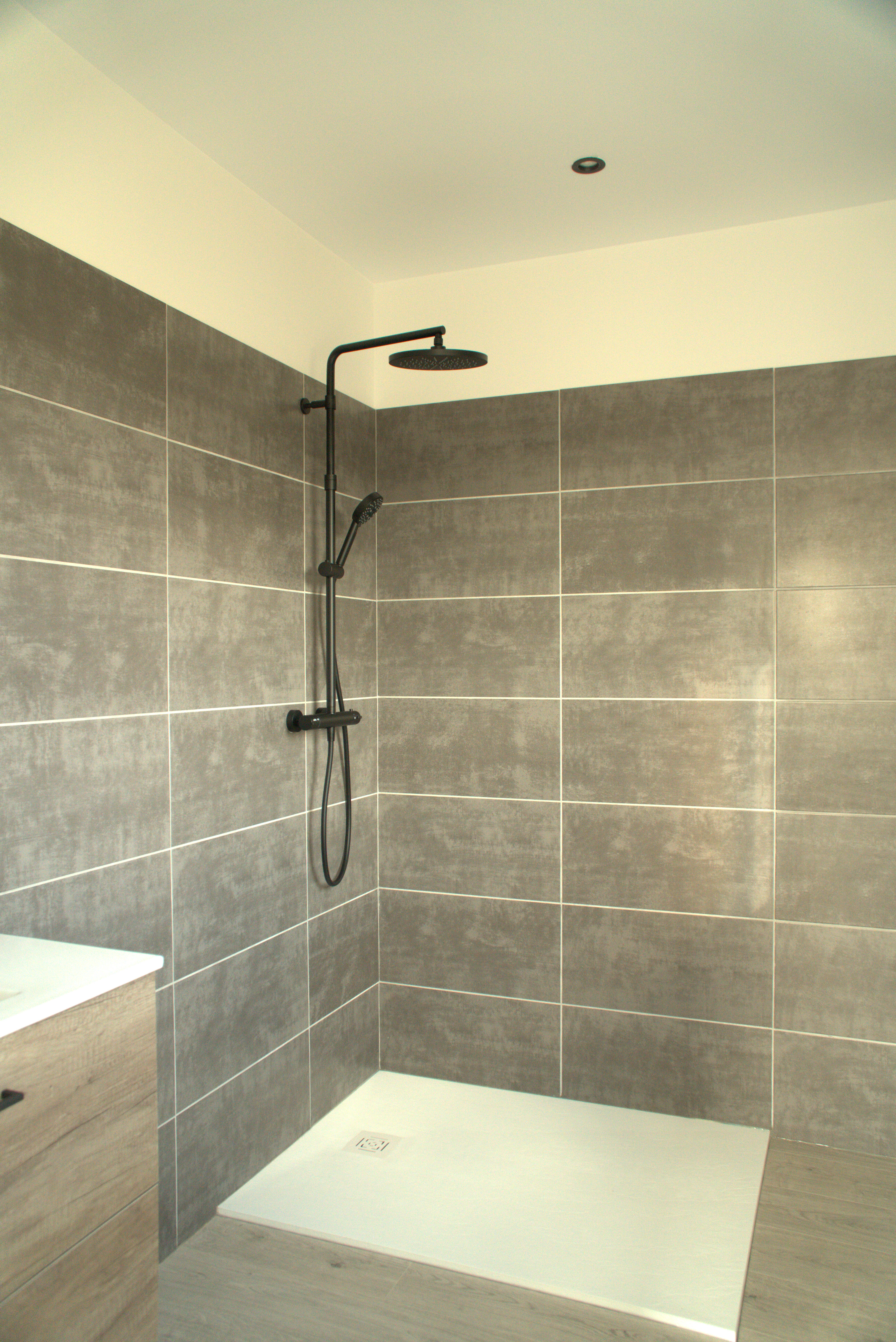 Des finitions extérieures modernes : crépis gris clair, tuiles foncées à l'étage, toit terrasse...