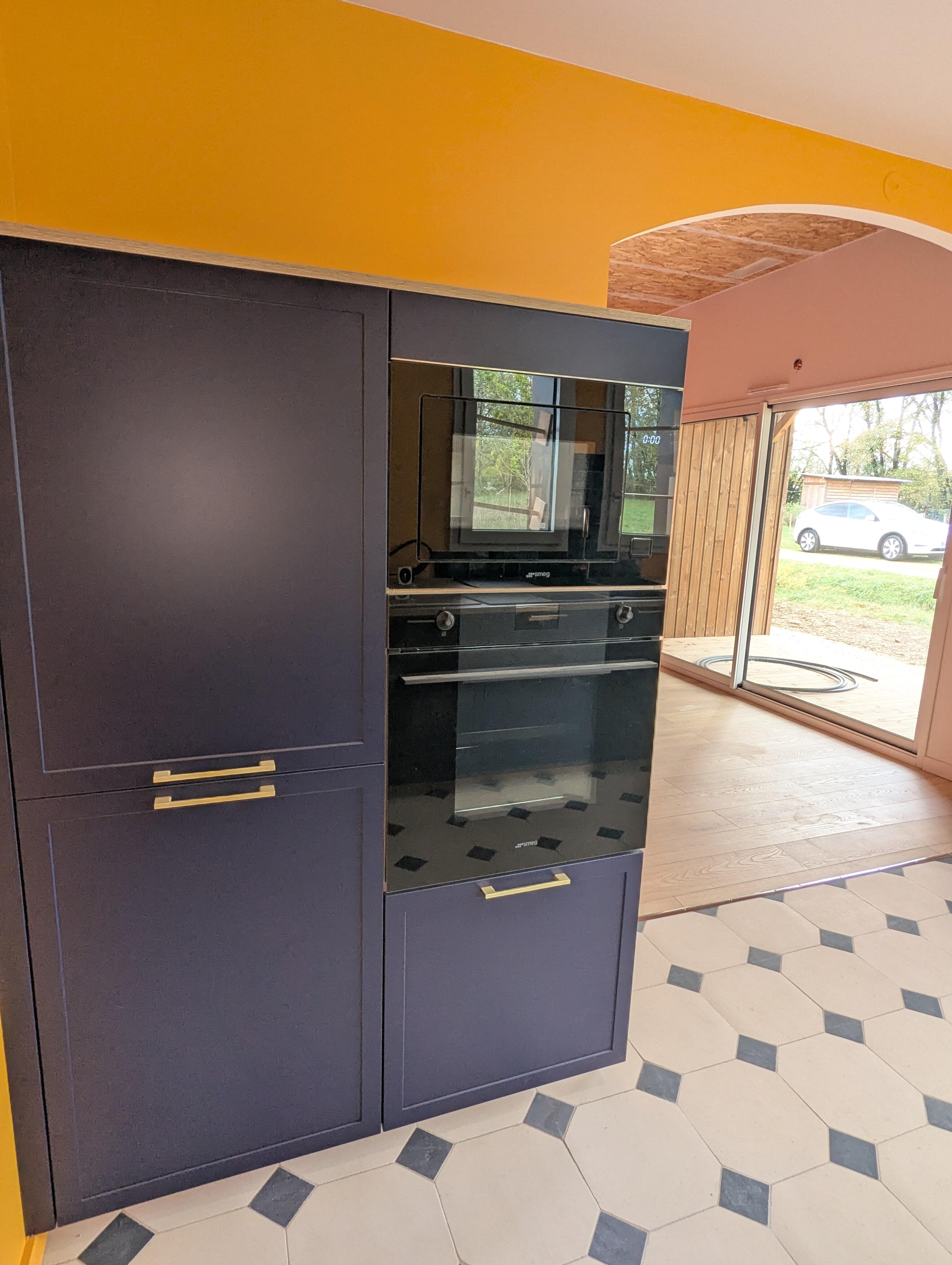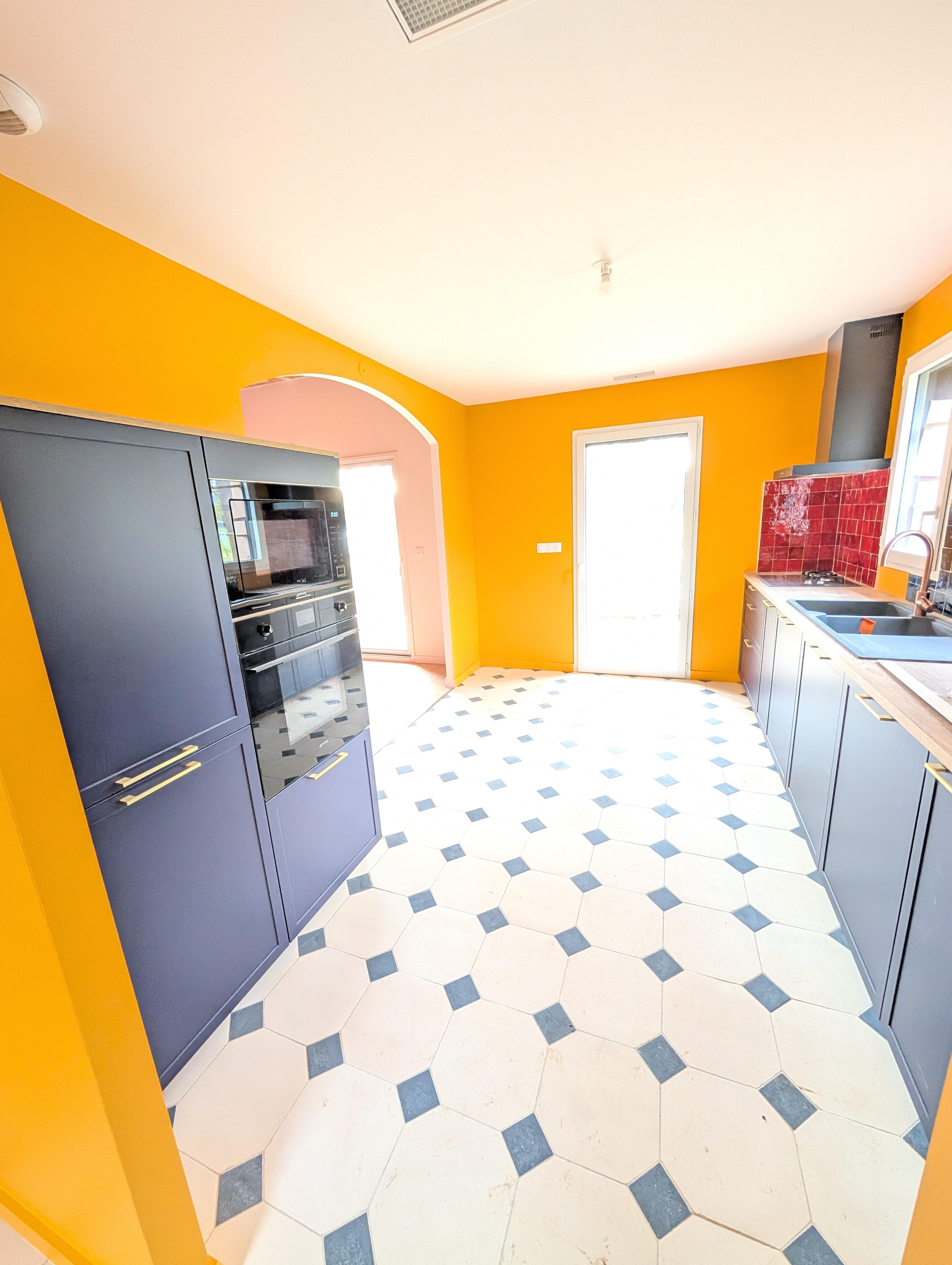 La cuisine : Un jaune d’ocre vibrant sur les murs qui contraste avec un mobilier bleu nuit profond et des carreaux de ciment graphiques.