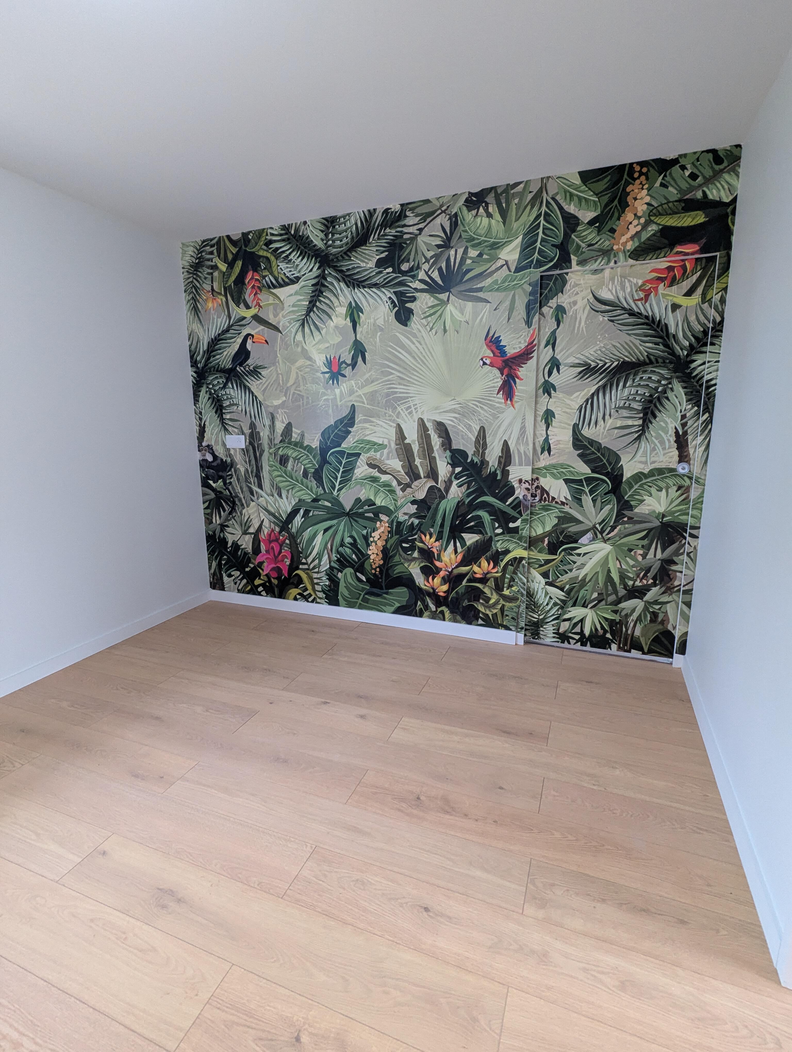 L'espace nuit : Un voyage exotique avec un papier peint panoramique "jungle" qui apporte profondeur et évasion à la chambre.