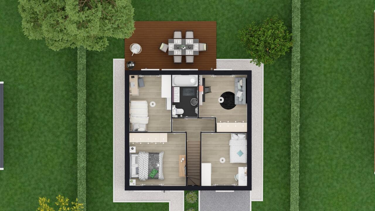 Découvrez ce modèle de maison à étage en ossature bois avec garage intégré de 14 m², parfaitement adapté aux petits terrains tout en offrant confort et esthétisme. Le rez-de-chaussée se compose d’une grande pièce de vie lumineuse avec cuisine ouverte favorisant la convivialité, ainsi qu’un cellier pratique et un WC séparé. À l’étage, un couloir dessert quatre chambres et une salle de bain avec WC, permettant à chaque membre de la famille de profiter de son propre espace.