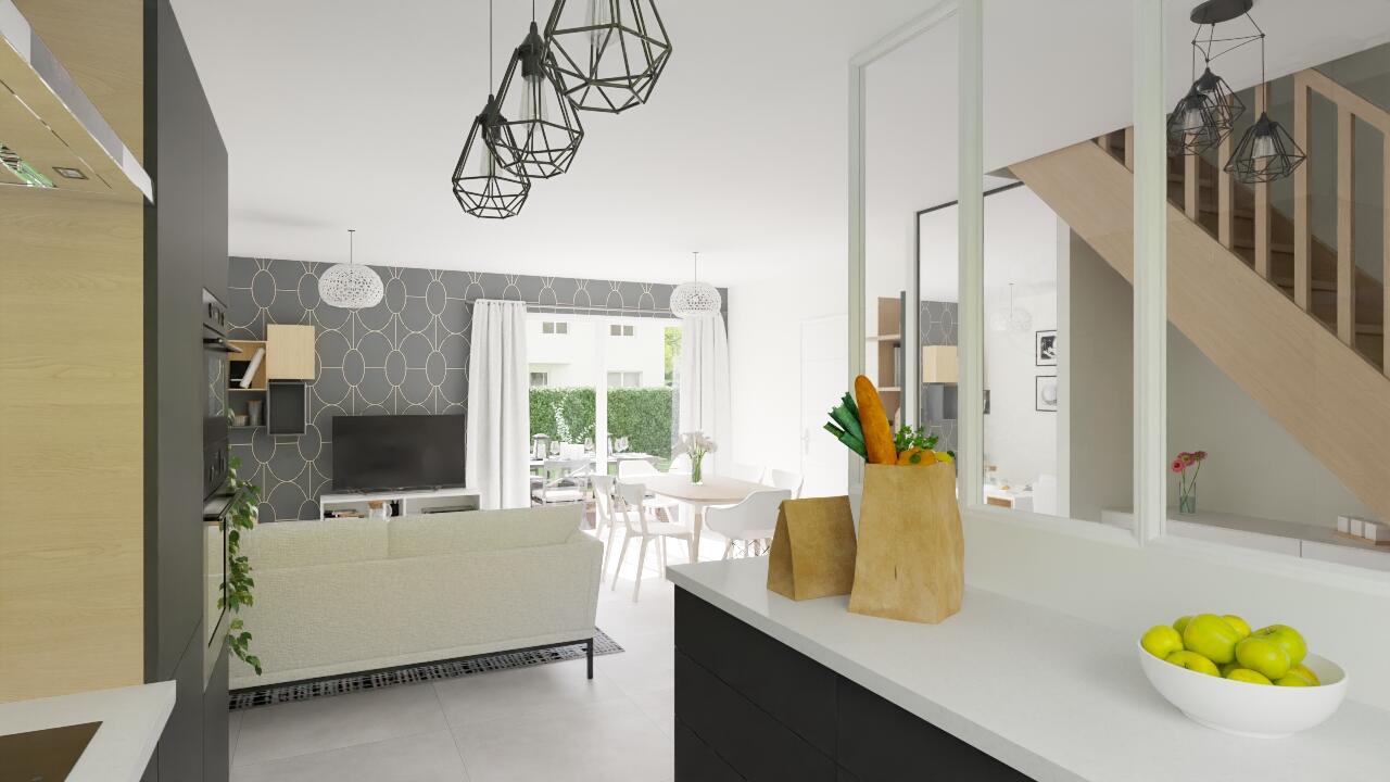 Le rez-de-chaussée, se compose d’une pièce de vie confortable et lumineuse et d’une cuisine ouverte afin de favoriser la convivialité de cette espace. Ce niveau dispose également d’un cellier et d’un WC séparé.