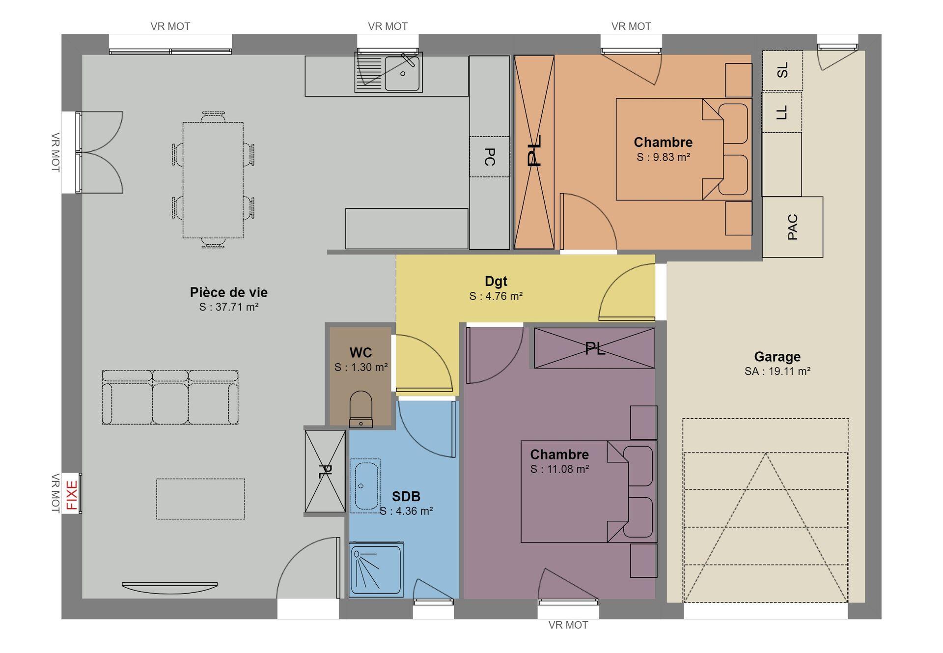 Nous vous proposons cette maison de 69 m² avec un garage de 19 m², composée d'une cuisine ouverte sur une pièce de vie de 37 m²