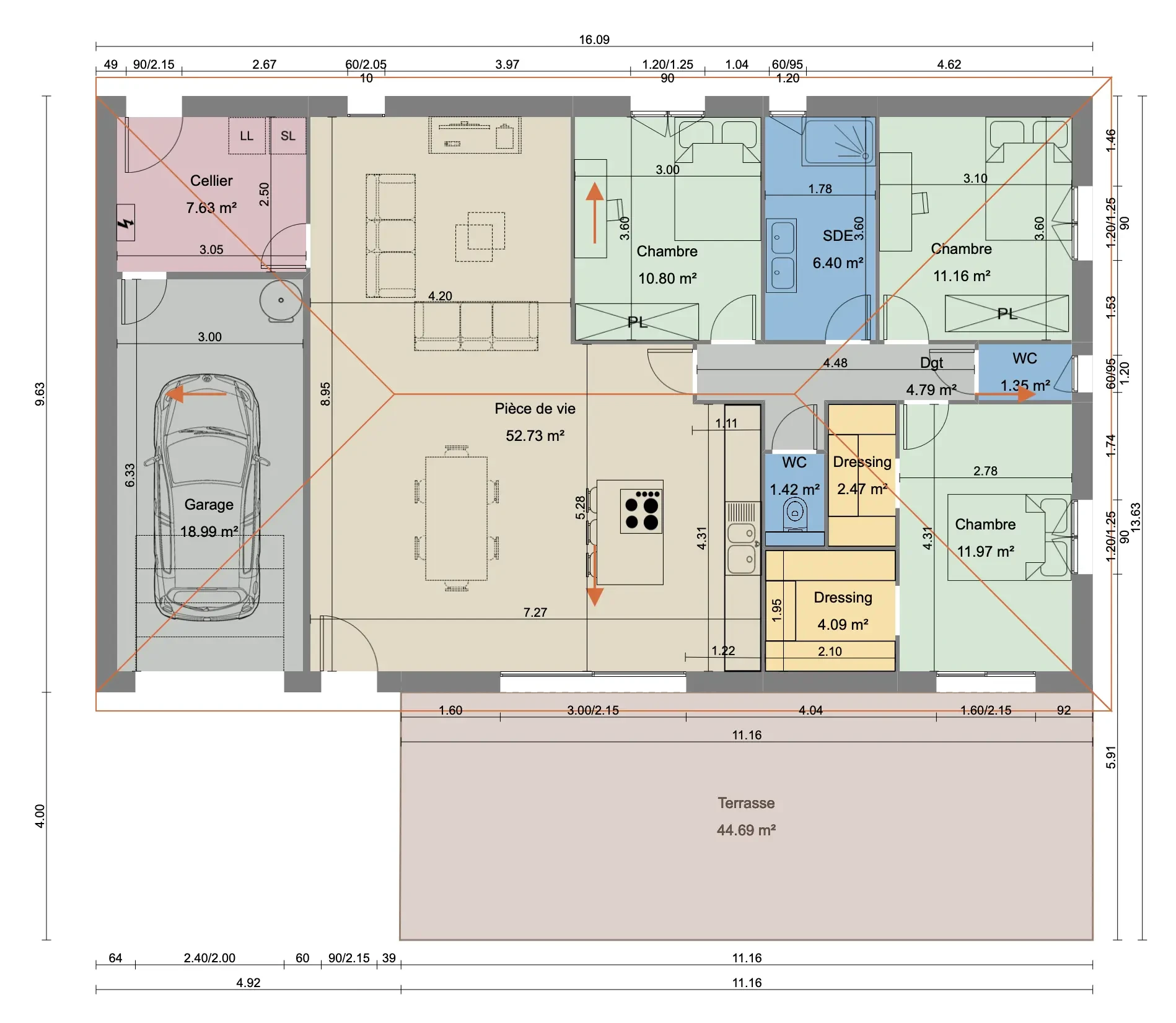 La maison offre une distribution simple et efficace, pensée pour le confort au quotidien :
