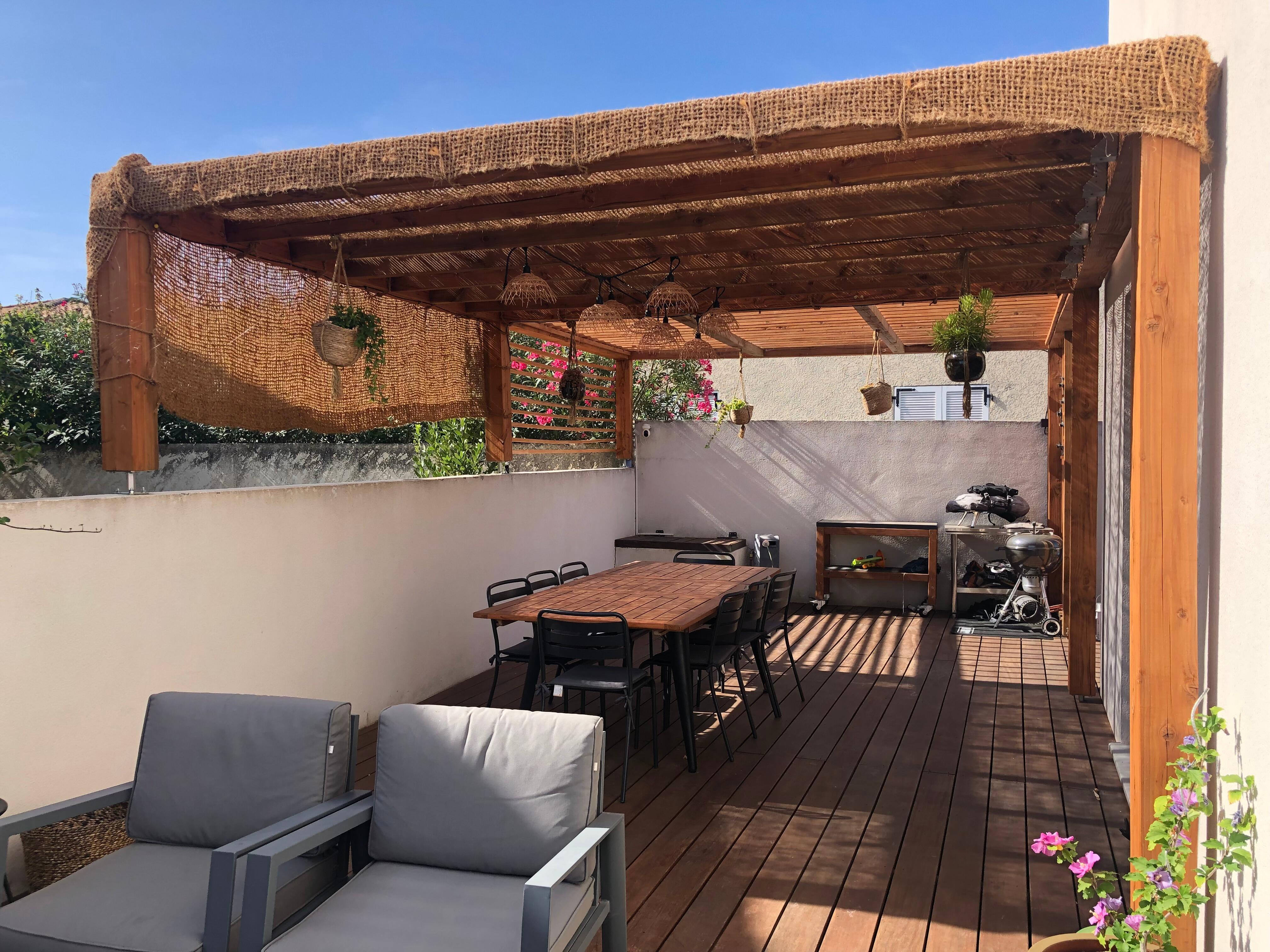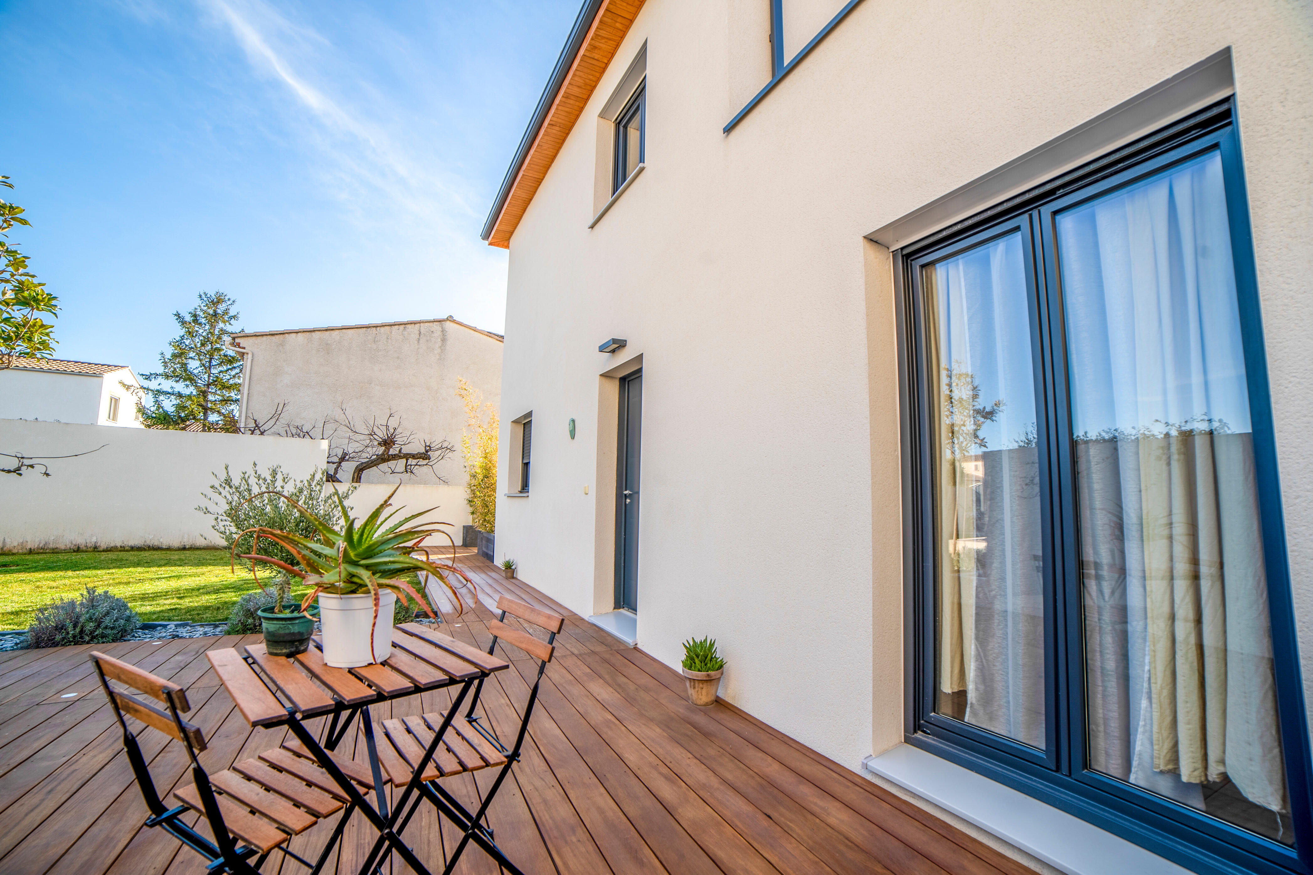 L'espace de vie, organisé en longueur, sépare distinguement la cuisine, la salle à manger et le salon. Chacun de ces espaces s'ouvre sur la terrasse en IPE et la pergola, que le client a fait ajouter plus tard. La suite parentale de 18m² avec dressing et une salle de bain privative est située au rez-de-chaussée.