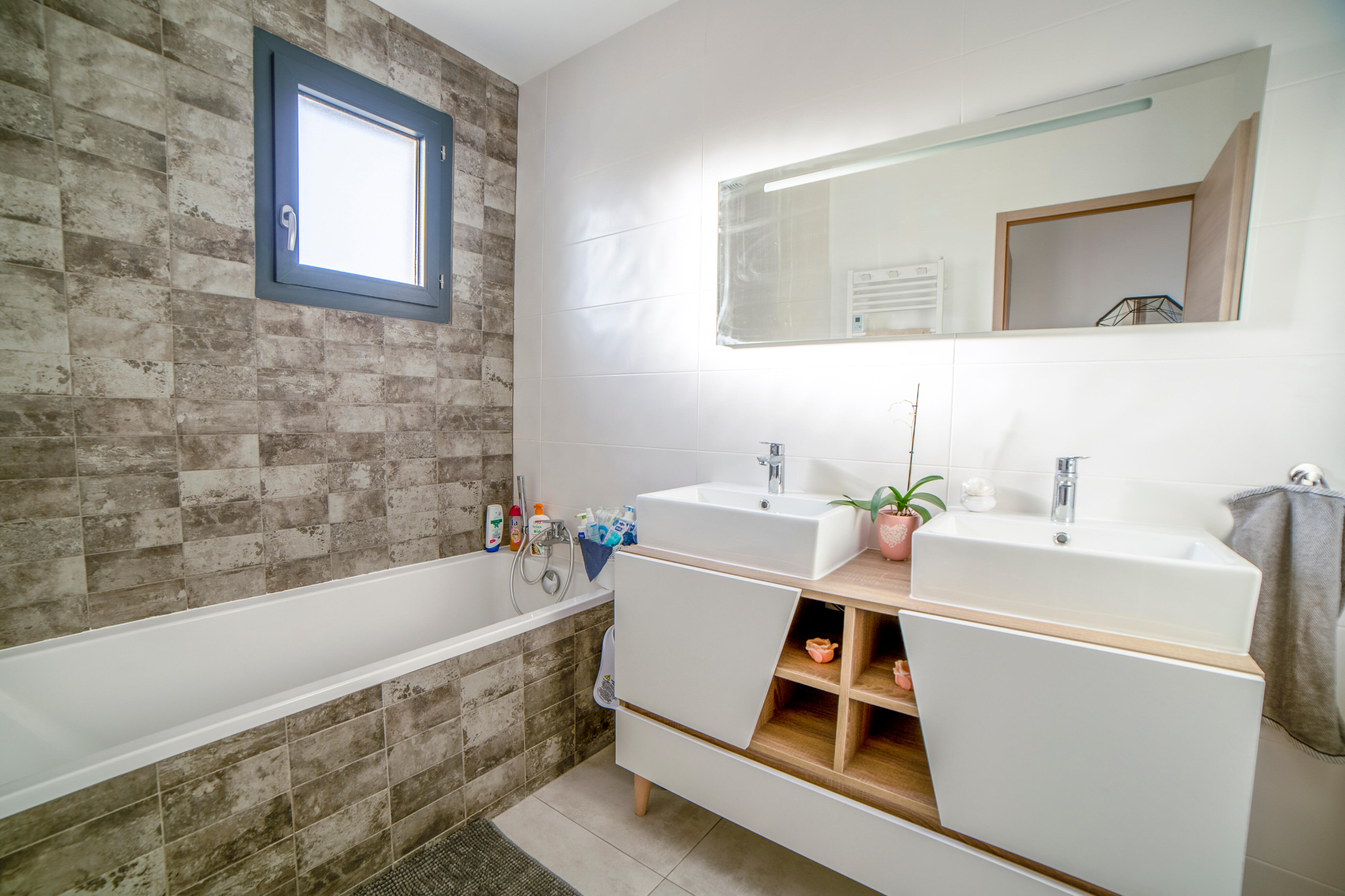 L'étage est composé de 3 chambres de plus de 10m² et d'une grande salle de bain avec baignoire. L'escalier contemporain, installé au centre de la pièce de vie, apporte une touche décorative forte qui s'accorde parfaitement avec l'esprit souhaité par nos clients pour leur maison.