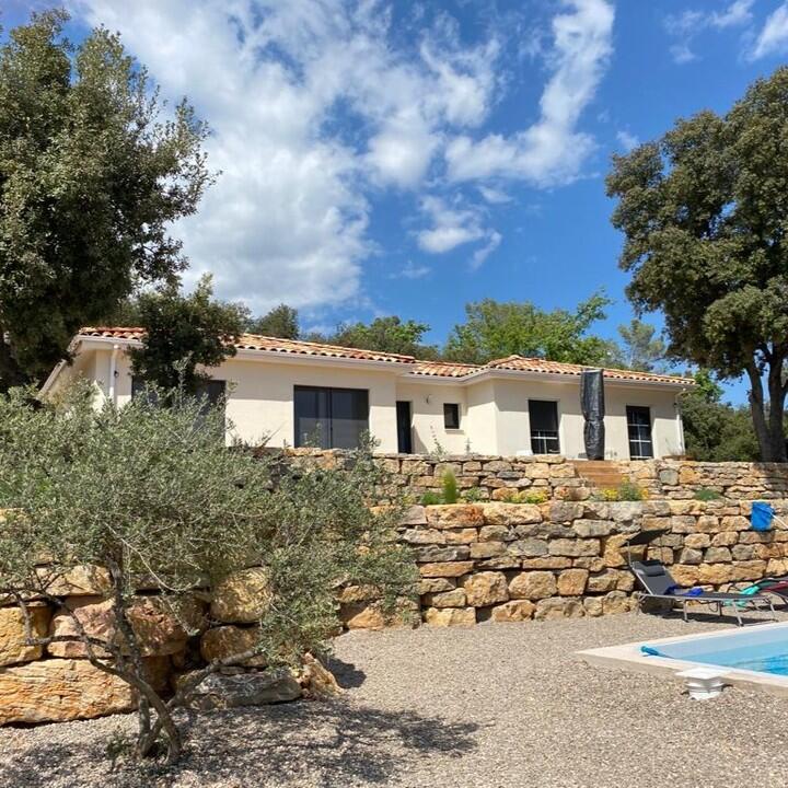 Un jardin aménagé ainsi qu'une piscine complète parfaitement cet espace de vie moderne et paisible. Idéale pour se détendre ou profiter des chaudes journées d’été dans le Var, la piscine s’intègre parfaitement dans le paysage.